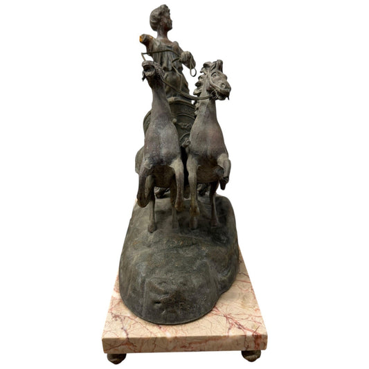 Vintage Spelter Chariot Mantel Clock Marble Base Lady & Horses Heavy Statue