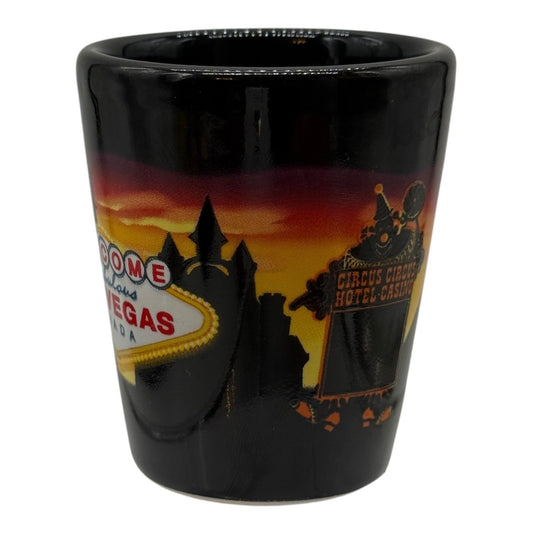 Las Vegas Shot Glass Souvenir Cityscape Welcome Sign Black Ceramic Vintage