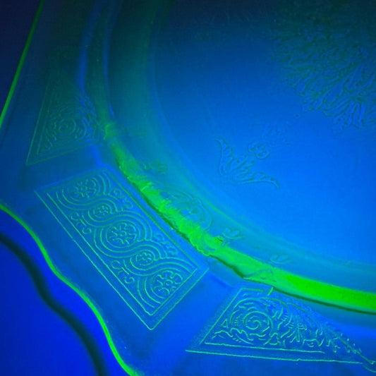 Vintage Uranium Green Depression Glass Octagonal Plate Sunburst Floral Etched